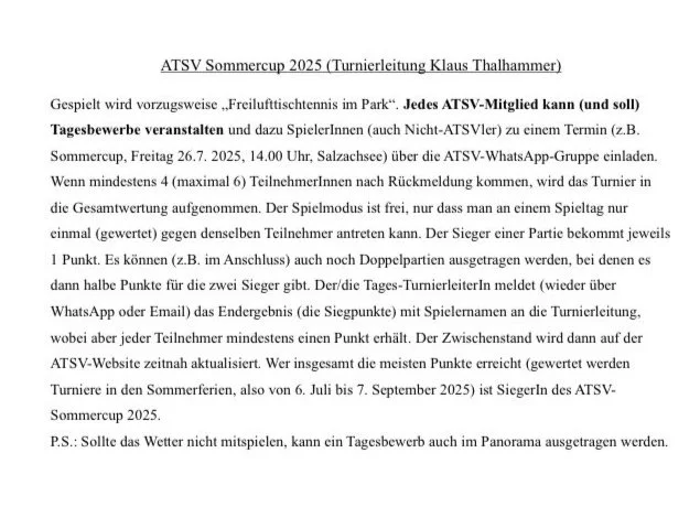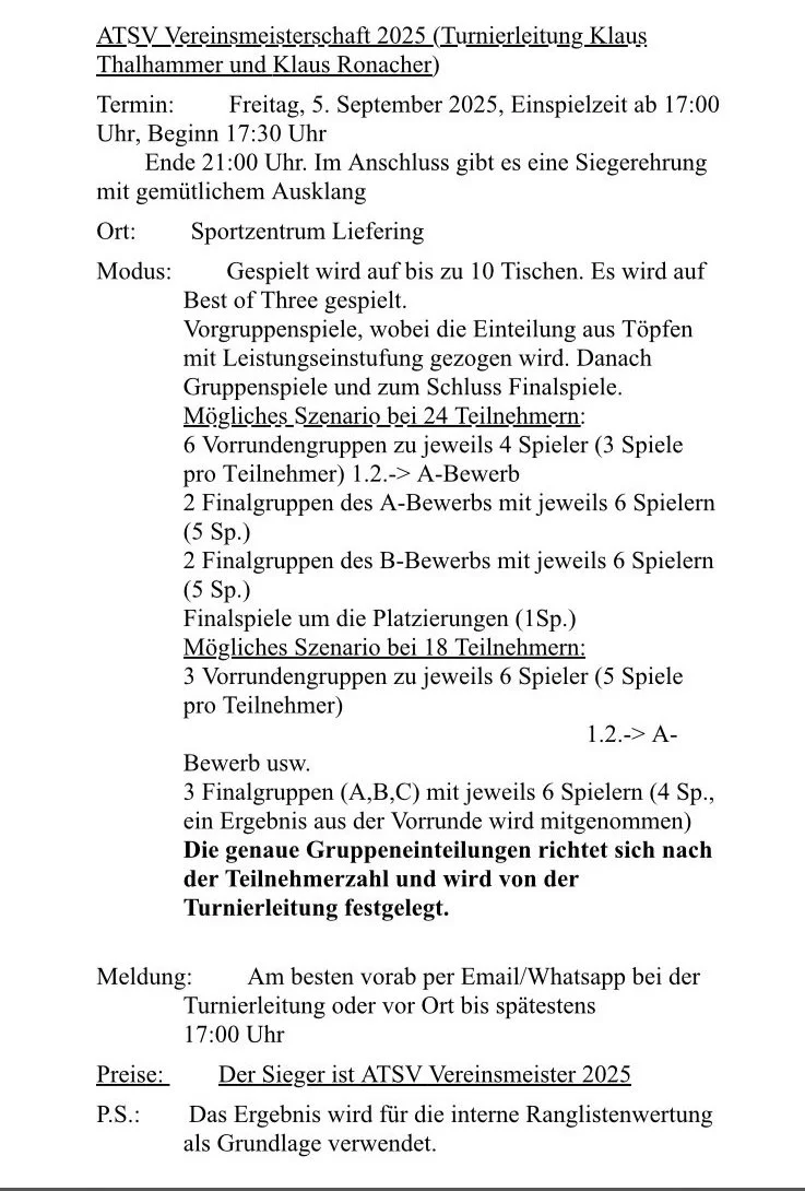 Teilnahmebedingung: Es sind alle Mitglieder der Tischtennissektion des ATSV-Salzburg spielberechtigt außer denjenigen Mitgliedern, die für andere Vereine im Meisterschaftsbetrieb des STTV spielberechtigt sind.