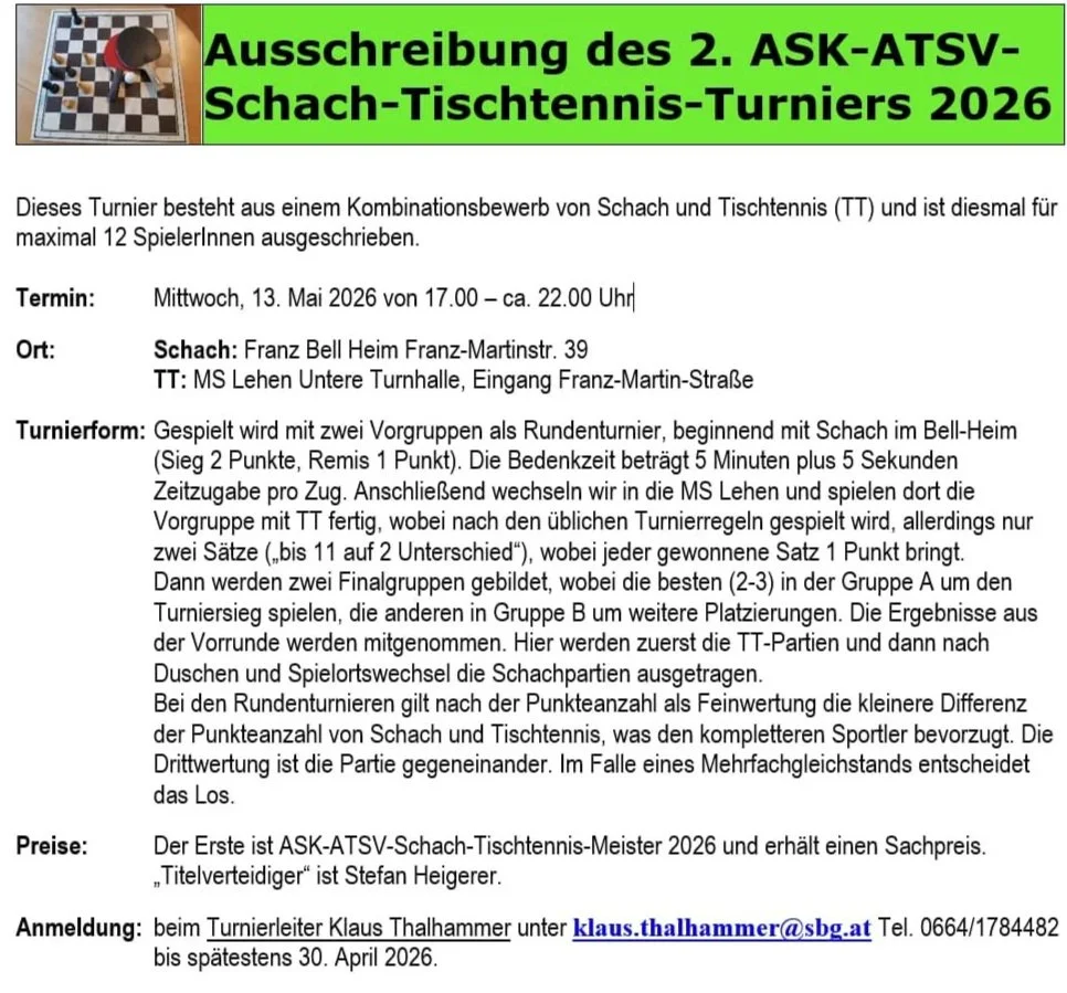 2. ASK-ATSV-Schach-Tischtennis-Turnier 2026